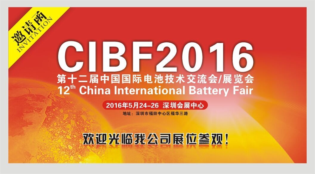 ? ? ? ?2016年5月24日-26日 ?第十二届中国国际电池技术交流会/展览会将在深圳市福田中心区?;?,深圳会展中心召开,我司展位号:9F90号,欢迎广大新老客户,到我公司展位区域了解新产品和行业技术交流。
